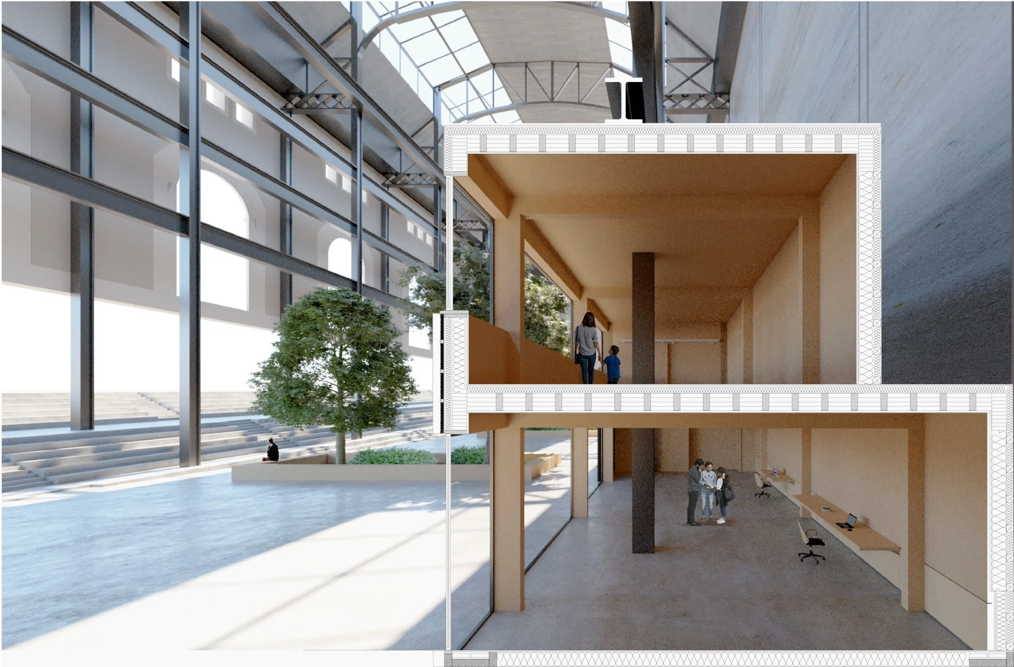 A bottom-up, community-first scheme has been a vital design condition from the first sketch: a building which the occupant can manipulate (interchangeable workshop/exhibition spaces) and can freely manoeuvre with ease (the stepped arena, arcade, and open park). The façade’s opening is a bold representation of the building’s change of function from private to public. The arcade reduces tension between the building’s previously uncoordinated interior/ exterior relationship. We concentrated on maximising the interior’s height to emphasise a feeling of openness and meditative serenity in a city renowned for its pace and power.